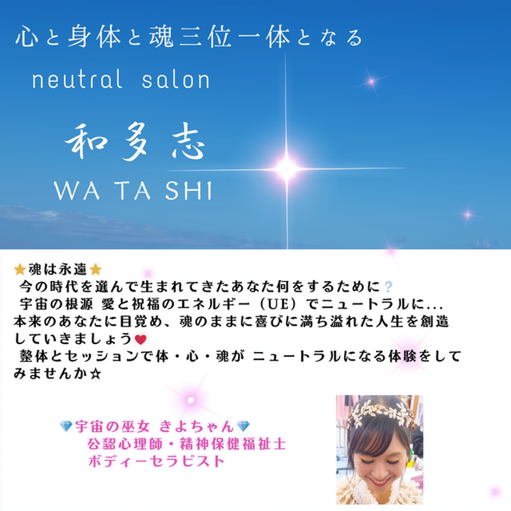 アースエンジェルとしての生きづらさを糧に、”魂の望みを叶え、使命を生きる方法”と”その先に広がる奇跡の世界”を自身とクライエントさん約900人のご経験を元に研究。